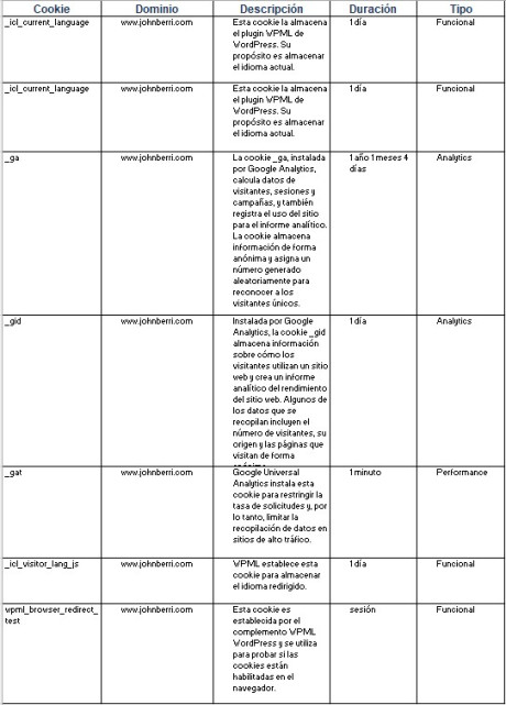 A continuación, se presenta la información detallada sobre las cookies utilizadas:
